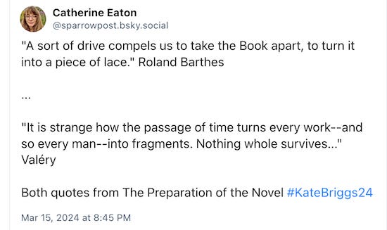 Hello everyone! We are nearing the end of the lectures in The Preparation of the Novel, which makes me sad, and we are well into the second half of This Little Art, which also makes me a little sad. I don’t really want the books to end, although, of course, I can always begin them again. Books never need to end.