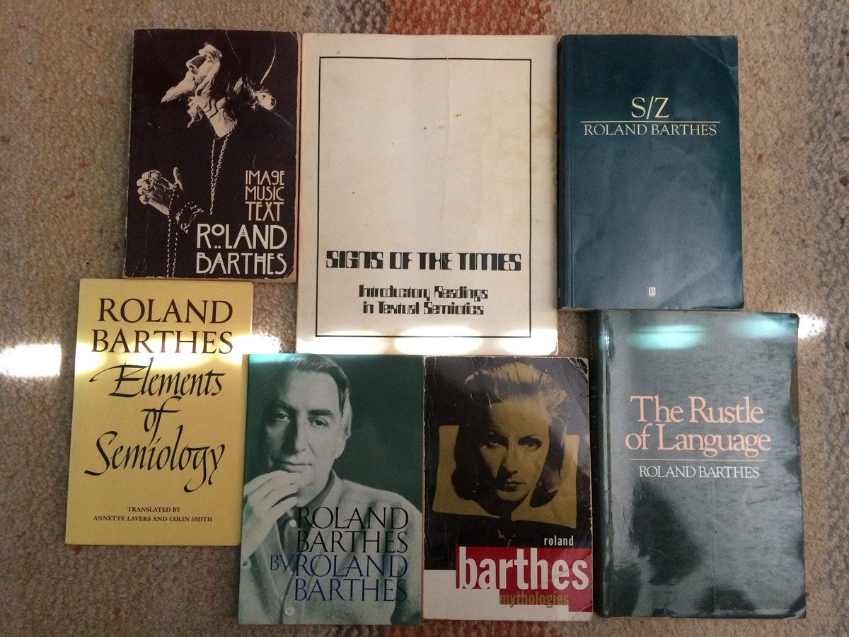 Here’s Rachel Malik’s collection of Roland Barthes books, posted in honor of the anniversary of his death on March 26th, 1980.