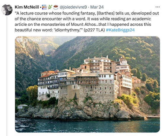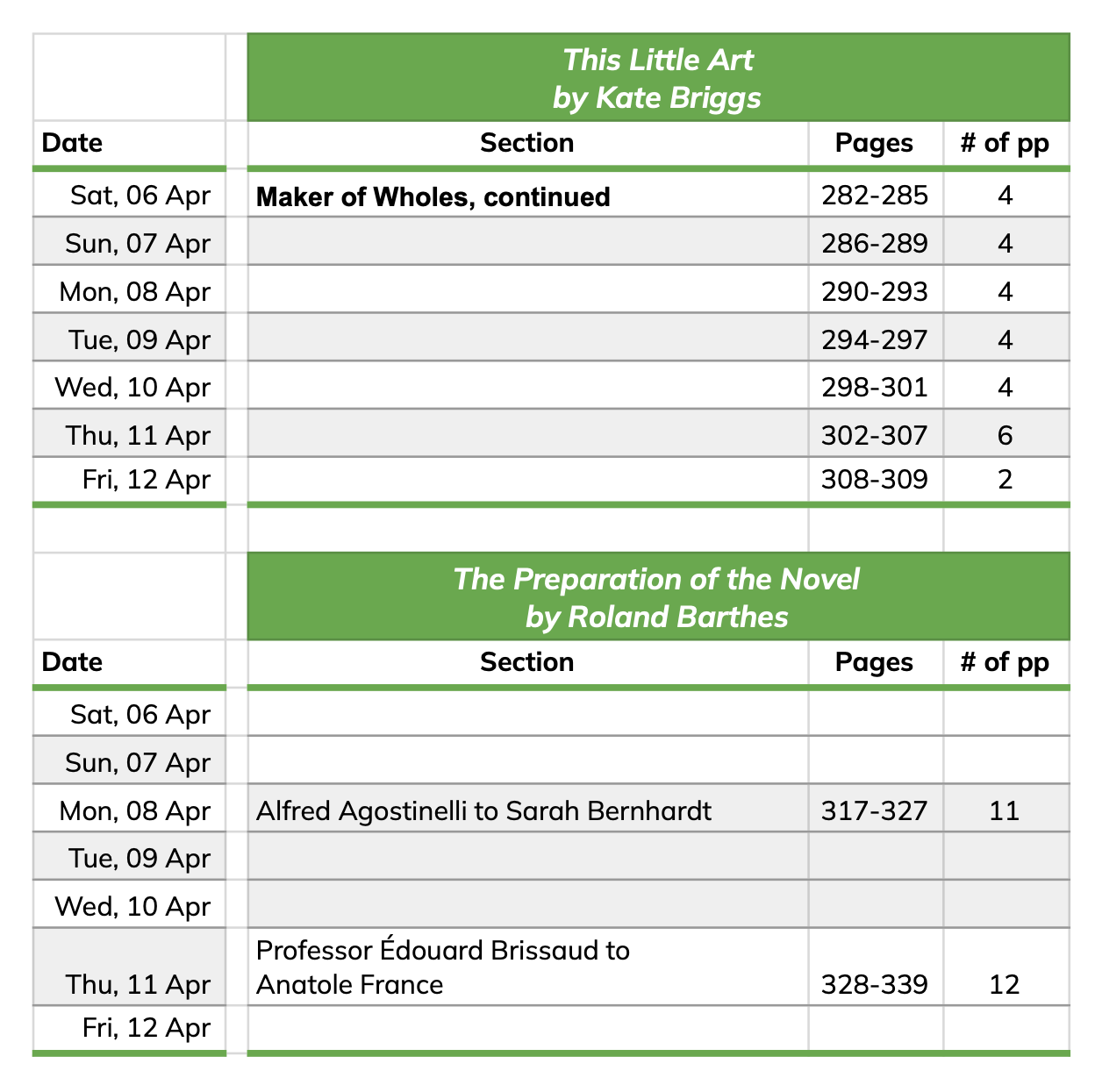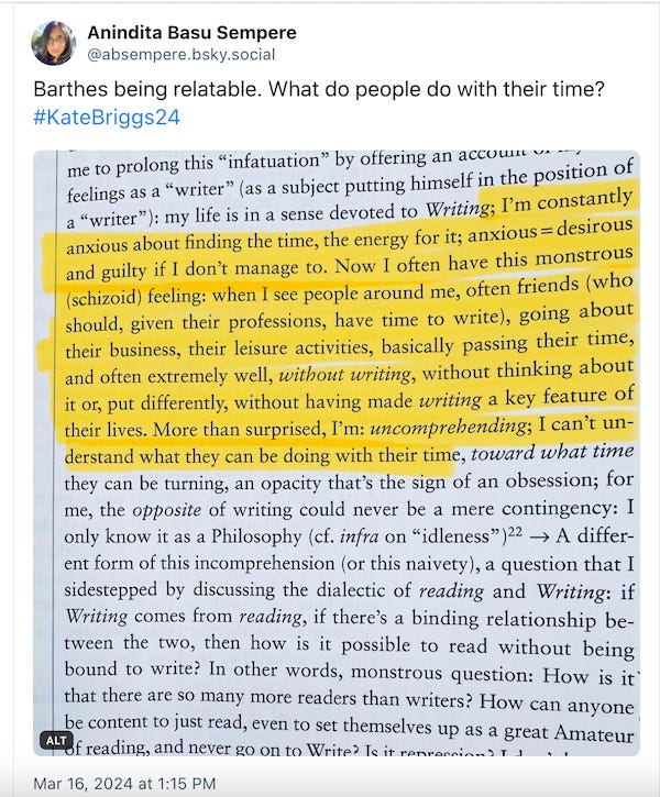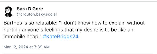 Barthes keeps on surprising me (and pleasing me deeply) with his... for lack of a better term... real-world-ness. This is my first experience with his work, and I think even well into TPotN I'm still somehow expecting it to be super abstract, removed from daily life. Sometimes it is rather abstract (not a problem) and sometimes, often, it's just so... real, relevant, immediate, and daily. Right now I'm thinking especially of the first few pages of the Feb. 16 session, in which RB discusses the separation (painful, complicated, maybe necessary?) between the writer and the world, the different forms this can take. On page 276, he writes of "... the burning timeliness of what I'm doing (Writing) and what's going on the in the world around me, neither sphere is really contemporaneous with the other..." I always feel like such a slow writer—both in the sense that it literally takes me what seems like a very long time to make poems, and also because the "what" of what I write about is almost always removed in time (I can't write about the present or even the recent past, it's much too close). I often feel a strong desire to just retreat into reading and writing, away from "the world," and then feel guilty and ashamed about that desire. Definitely I experience my own version of the separation RB writes about, and like so many other lectures in TPotN, this one makes me feel less alone.