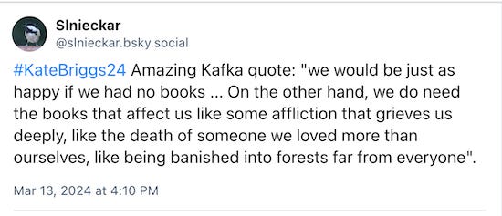 On p. 290, Briggs mentions a panel discussion on translating Kafka, which you can watch here.